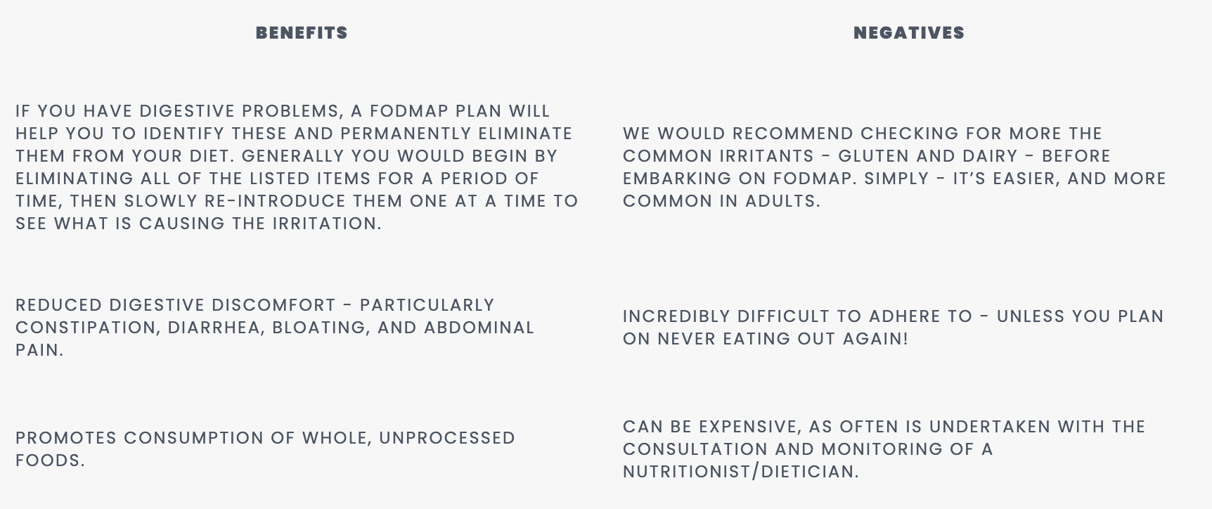 OUR RECOMMENDATION: FODMAP isn’t something you really need to do, unless you really need to do it (In our heads that totally makes sense…). We’d suggest if you have some gut irritations, try cutting out gluten and dairy for 30 days. If you are still suffering, it might be time to start looking at FODMAP’s - you can do this one your own with some online research, however can be a lot easier to monitor/stay on track with the aid of a nutritionst - of which we can recommend a couple of superstars!