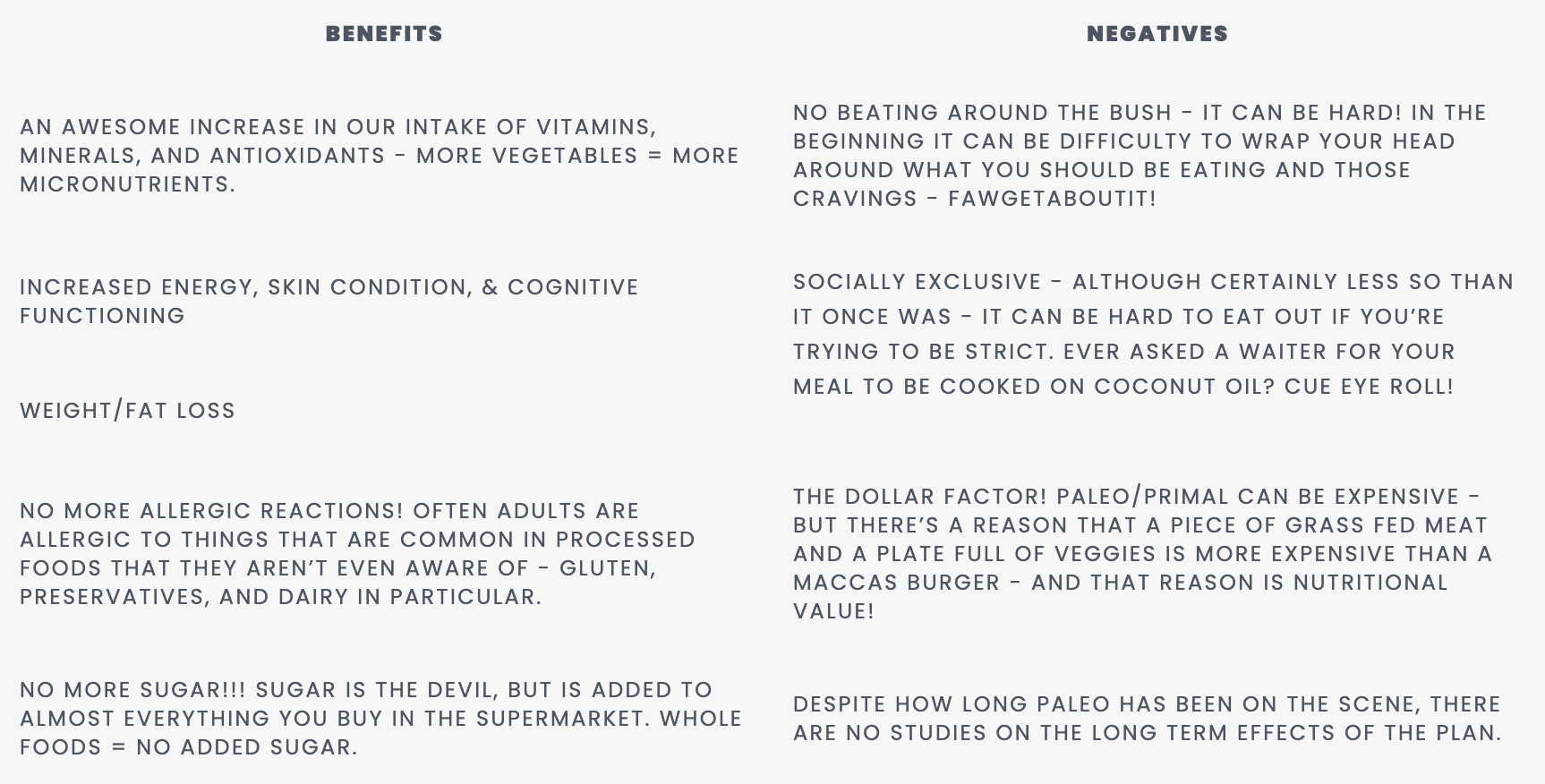 OUR RECOMMENDATION: Look here’s what we’re about - real foods, no added crap. It just happens that paleo/primal really fits into this philosophy. We believe the method can provide a really great, healthy life, but we’re not big believers in being overly ‘strict’ with all the rules. For example, if high fat dairy agrees with you, we think go for it - the benefits seem to outweigh the negatives! Same with legumes (particularly if you’re a vegetarian) - if your body thrives on them, why not. Just do us a favour and always check the ingredients for added nasties!