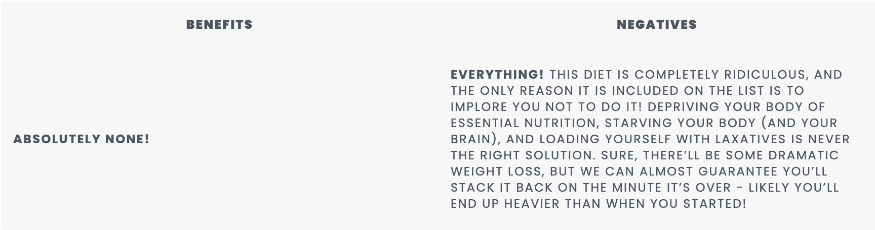 OUR RECOMMENDATION: There is no magic pill for health and weight loss - stop looking for one! If you’re keen for a body detox, there are some great ‘juice fasts’ out there that allow your body to refresh & recharge, while ensuring that it is still being supplied with essential nutrients for survival. We suggest checking out the documentary Fat, Sick & Nearly Dead (available on netflix) which will give you a load of information, and online resources, to make the best decision for yourself.