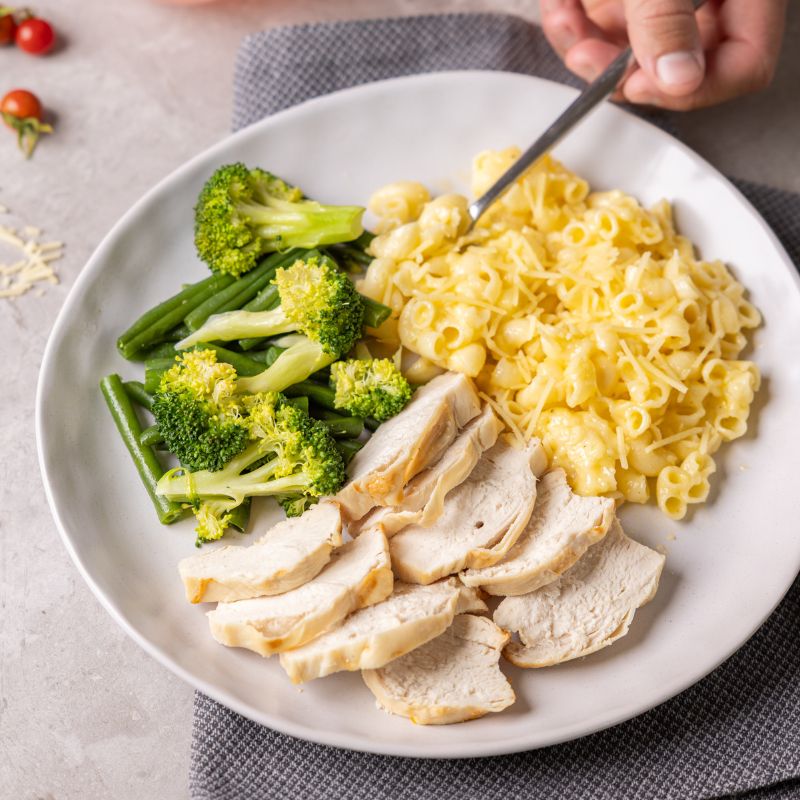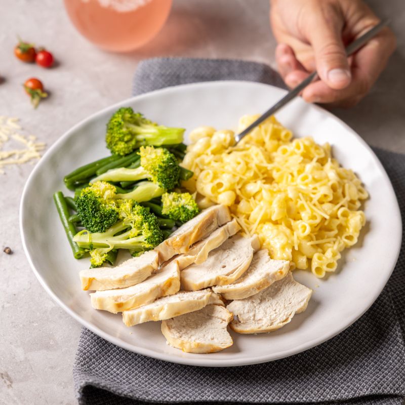 Creamy, cheesy mac meets tender chicken breast, with a side of vibrant greens for balance. Made with gluten-free pasta and real cheddar and parmesan, it’s comfort food without compromise.