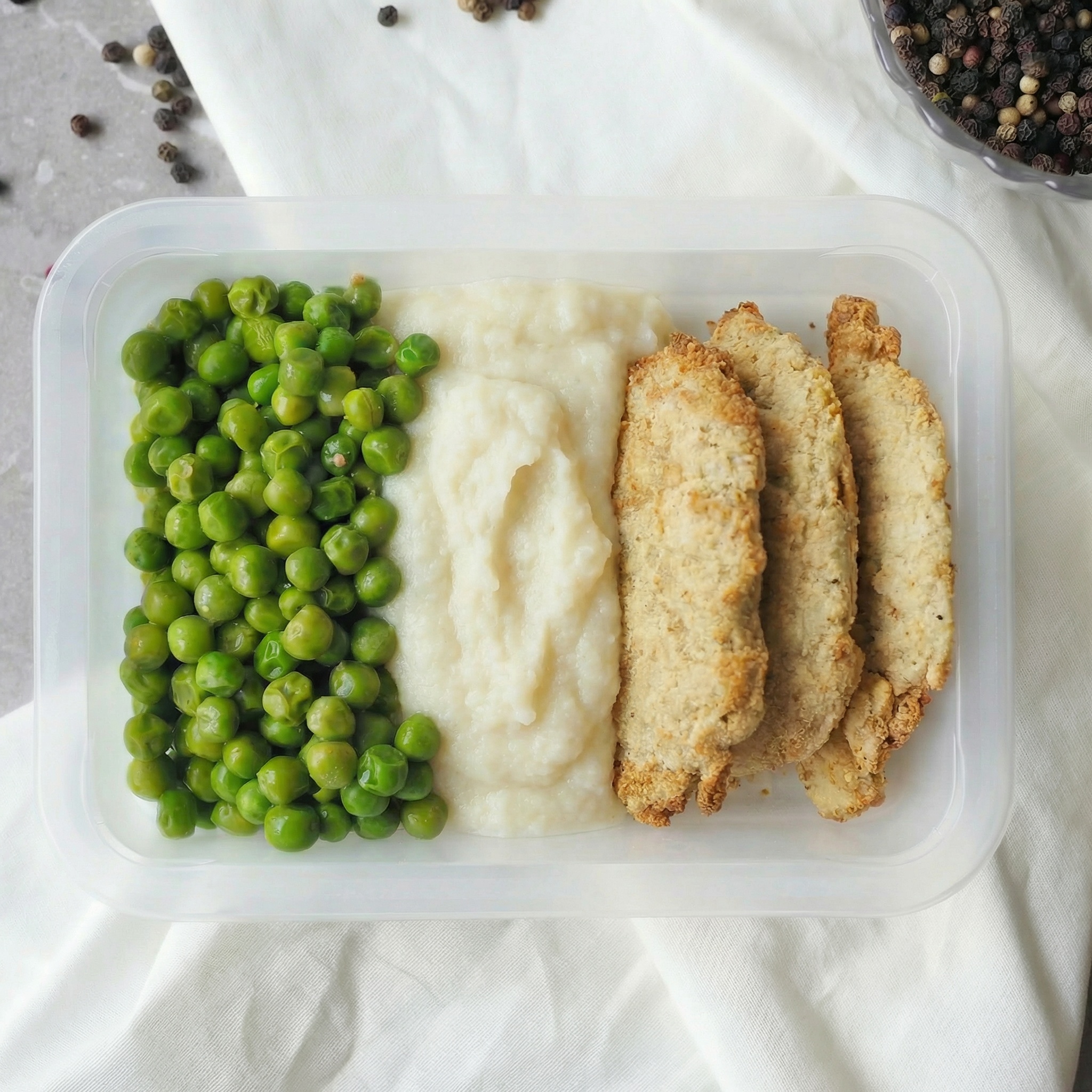 Ingredients: Cauliflower Mash (Cauliflower (54%), Butter Salted (Pasteurised Cream (Milk), Salt), Salt), Crumbed Chicken (Chicken (20%), Peas, Almond Meal, Egg, Salt, Black Pepper.