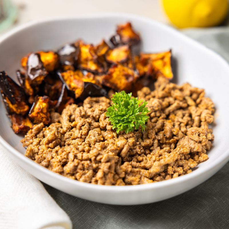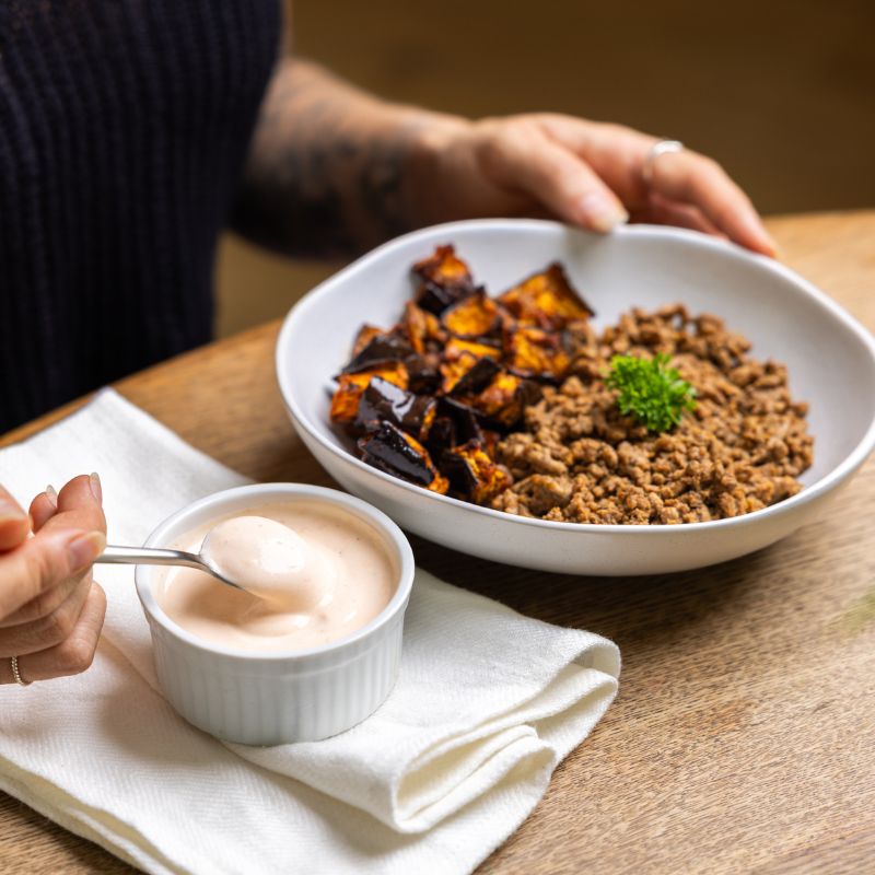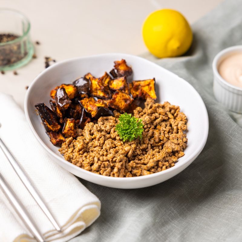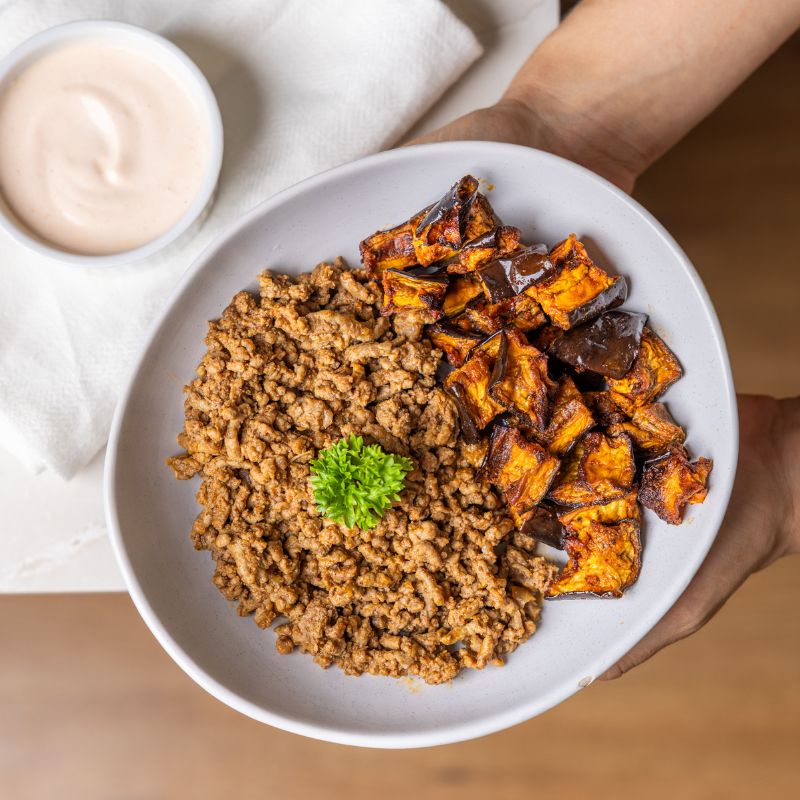 with Roasted Eggplant and Harissa YogurtMorocco is always a good idea. Introducing our new Moroccan Spiced Beef! Tender beef mince cooked low and slow with smoked paprika, cumin, coriander, and a gentle touch of chilli. Served over sweet roasted eggplant and capsicum, and finished with a cool dollop of creamy Greek yoghurt, this dish delivers a perfect balance of warmth, spice, and freshness. Comforting, nourishing, and just a little bit exotic.